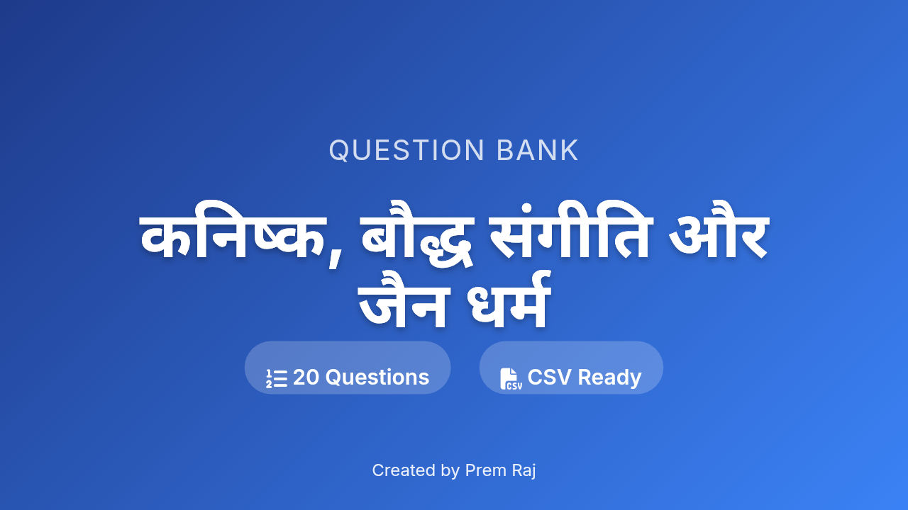 🚀 कनिष्क, बौद्ध संगीति और जैन धर्म Question Bank 📄 Contains: 20 Questions 👨💻 Author: Created by Prem Raj ✅ Features: - Auto-formatted Math Equations - LMS Compatible CSV - Verified Answers Dow